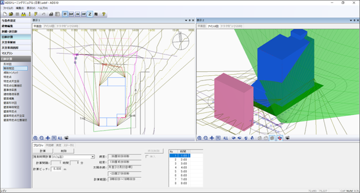 こちらはほんの一例です。BIMソフト「Autodesk Revit」を使い、建ぺい率・容積率・高さ制限などの法規チェック(ボリュームスタディ)を3D上で行います。さらに、専用の追加ツール「ADS-BT for Revit」を組み込むことで、日影・斜線・天空率の解析をスムーズに実施でき、設計段階から最適なボリュームとデザインを検討することができます。